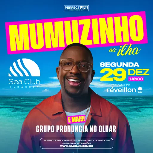 A Semana de Réveillon em Ilhabela inicia com samba, alegria e exclusividade! No dia 29 de dezembro, o palco do Sea Club Ilhabela receberá Mumuzinho, um dos maiores ícones do pagode nacional, em um show especial no formato Sunset, começando às 14h, com o mar como cenário e a energia vibrante da ilha mais bela do Brasil.